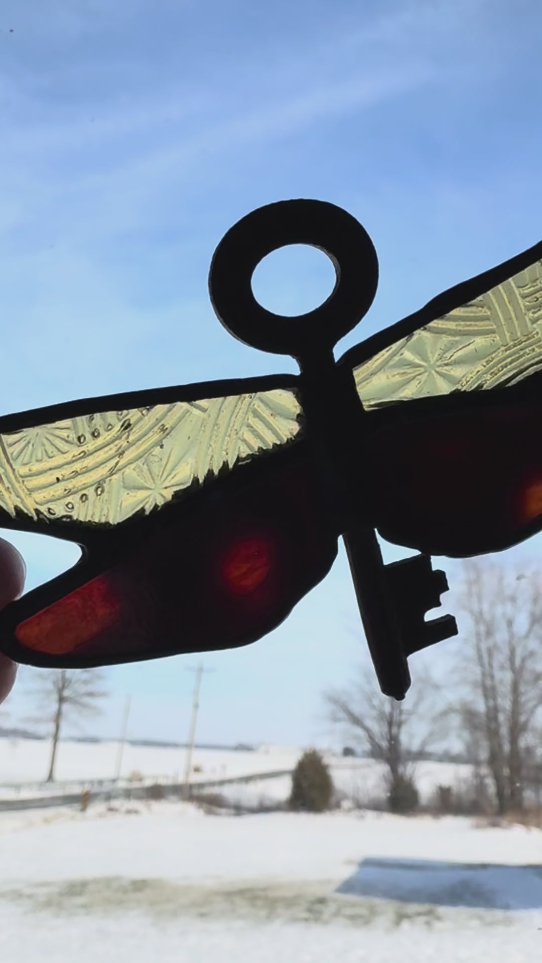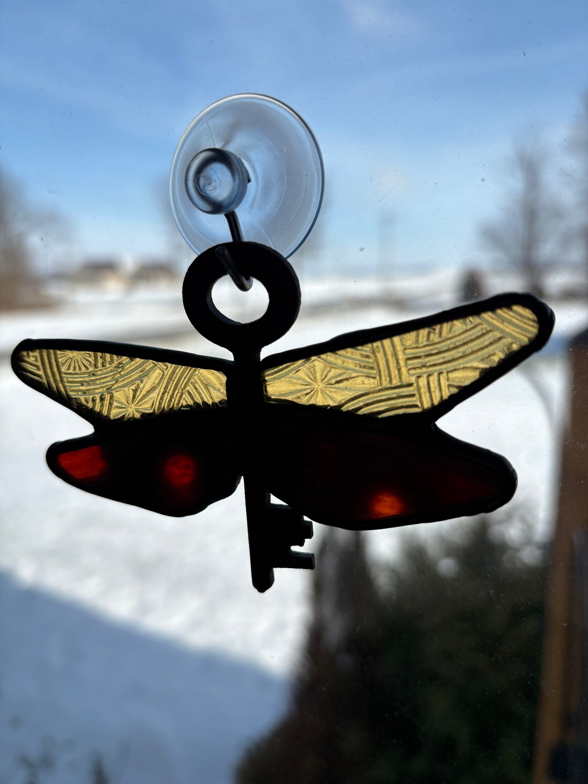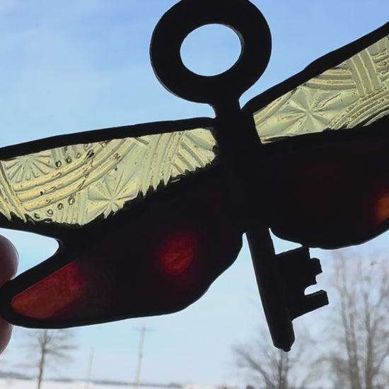 I’ve made a ton of these fun dragonfly’s thru the summer season and this glass colorway is one of my favorites!! The deep red with amber peeking thru and then etched amber wings to match - gorgeous!! Throw in a thrifted key for the dragonfly body and it’s a perfect match. It measures approximately 4x3 inches.