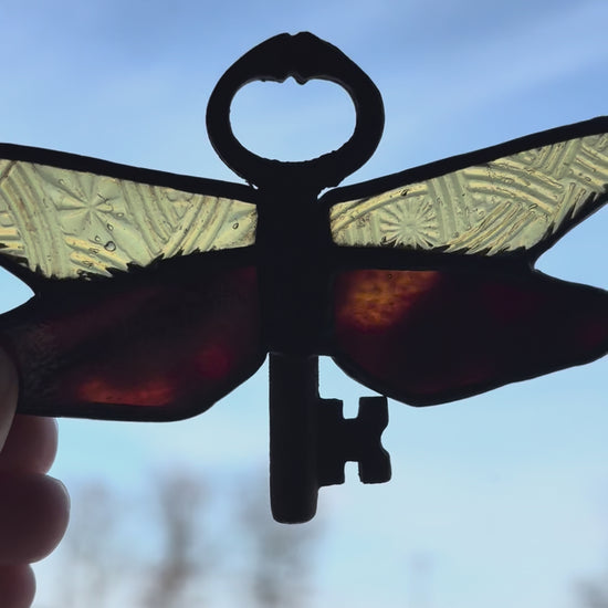 I’ve made a ton of these fun dragonfly’s thru the summer season and this glass colorway is one of my favorites!! The deep red with amber peeking thru and then etched amber wings to match - gorgeous!! Throw in a thrifted key for the dragonfly body and it’s a perfect match. It measures approximately 4x3 inches.