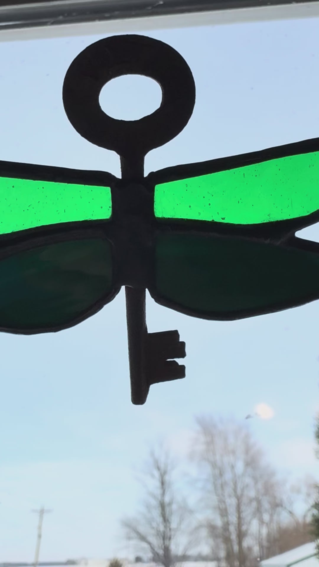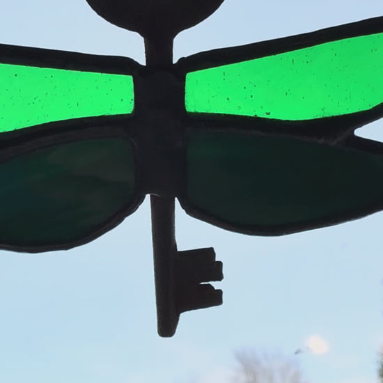 I’ve made a ton of these fun dragonfly’s thru the summer season and this glass colorway combines glass from Ragland Park from Kokomo Opalescent Glass Company and estate glass. The deep green actually has lighter streaks you can see in bright sun! Throw in a thrifted key for the dragonfly body and it’s a perfect match. It measures approximately 4x3 inches.