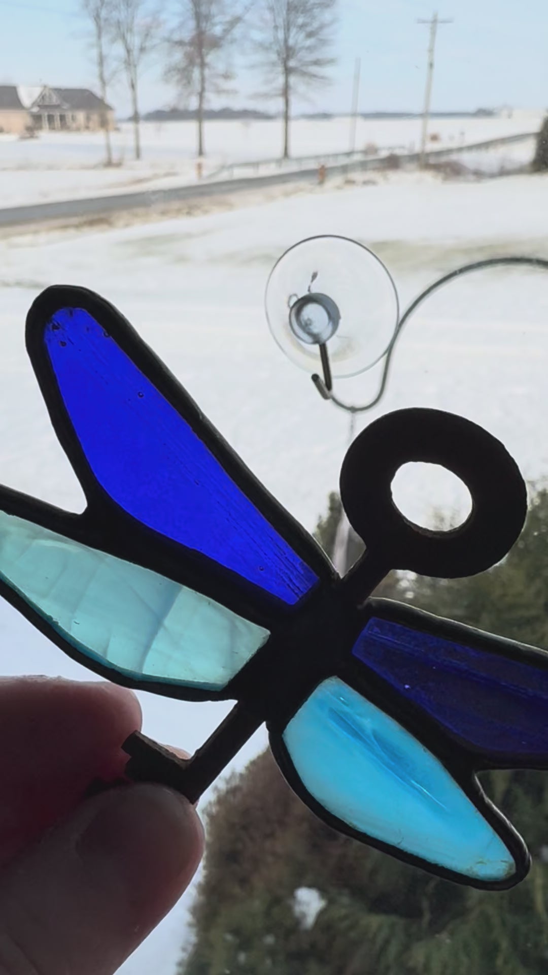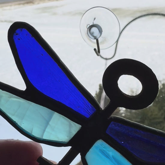 I’ve made a ton of these fun dragonfly’s thru the summer season and this glass colorway combines a gorgeous deep cobalt blue and a streaky vibrant light blue. Throw in a thrifted key for the dragonfly body and it’s a perfect match. It measures approximately 4x3 inches.
