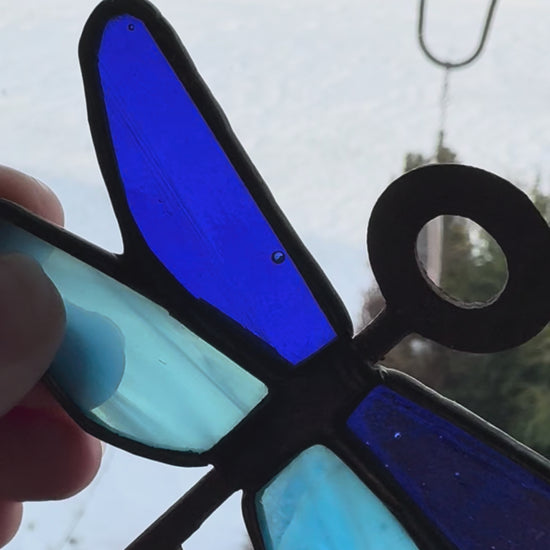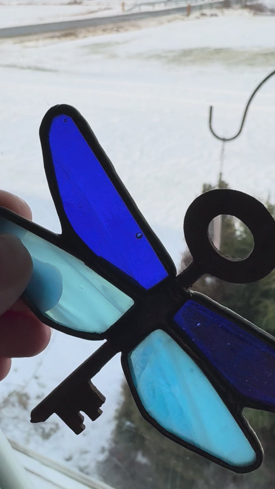 I’ve made a ton of these fun dragonfly’s thru the summer season and this glass colorway combines a gorgeous deep cobalt blue and a streaky vibrant light blue. Throw in a thrifted key for the dragonfly body and it’s a perfect match. It measures approximately 4x3 inches.