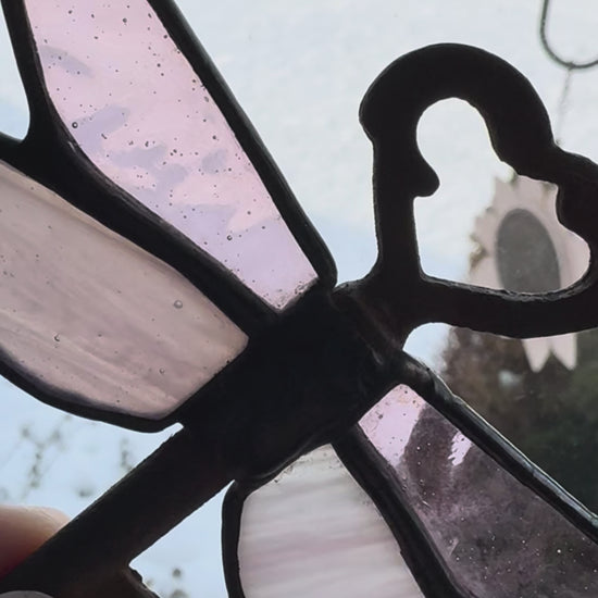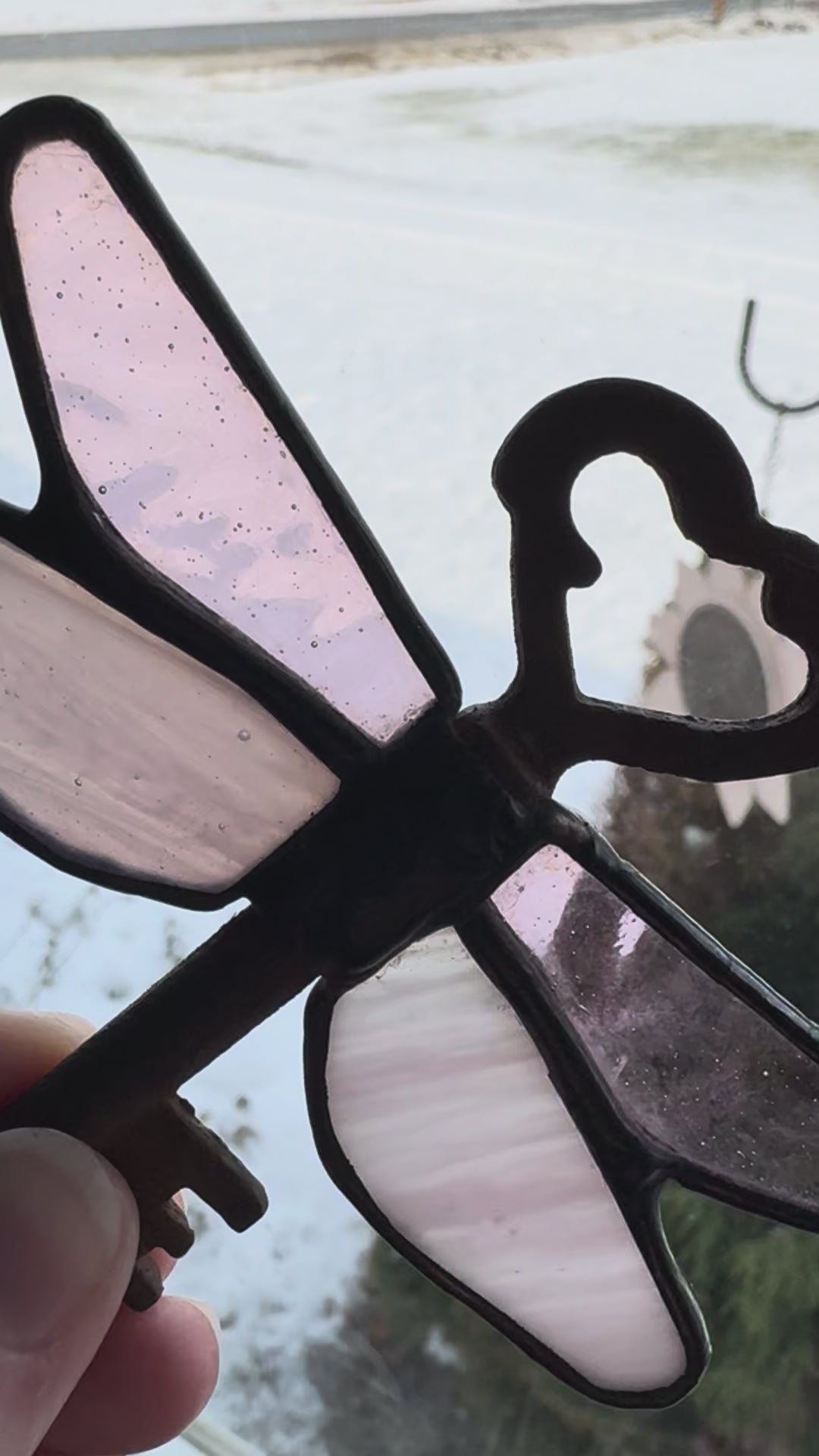 I’ve made a ton of these fun dragonfly’s thru the summer season and this glass colorway combines really fun light purples! Throw in a thrifted key for the dragonfly body and it’s a perfect match. It measures approximately 4x3 inches.