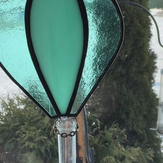 Materials: glass, copper foil, lead solder, black patina, finishing wax, glass tube, chain