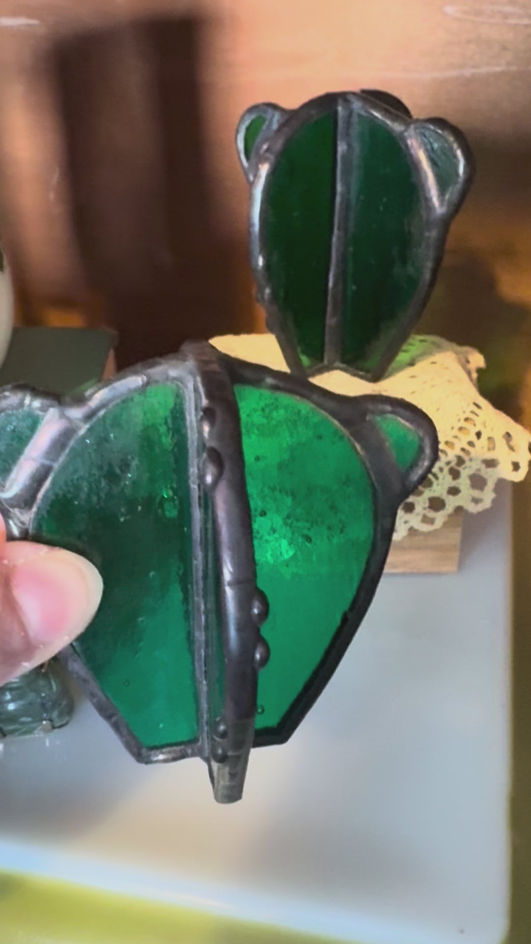 This green glass was sourced out of the scraps at Ragland Park at Kokomo Opalescent Glass Company. They measure approximately 2.5x2.75 inches at the widest/tallest points.