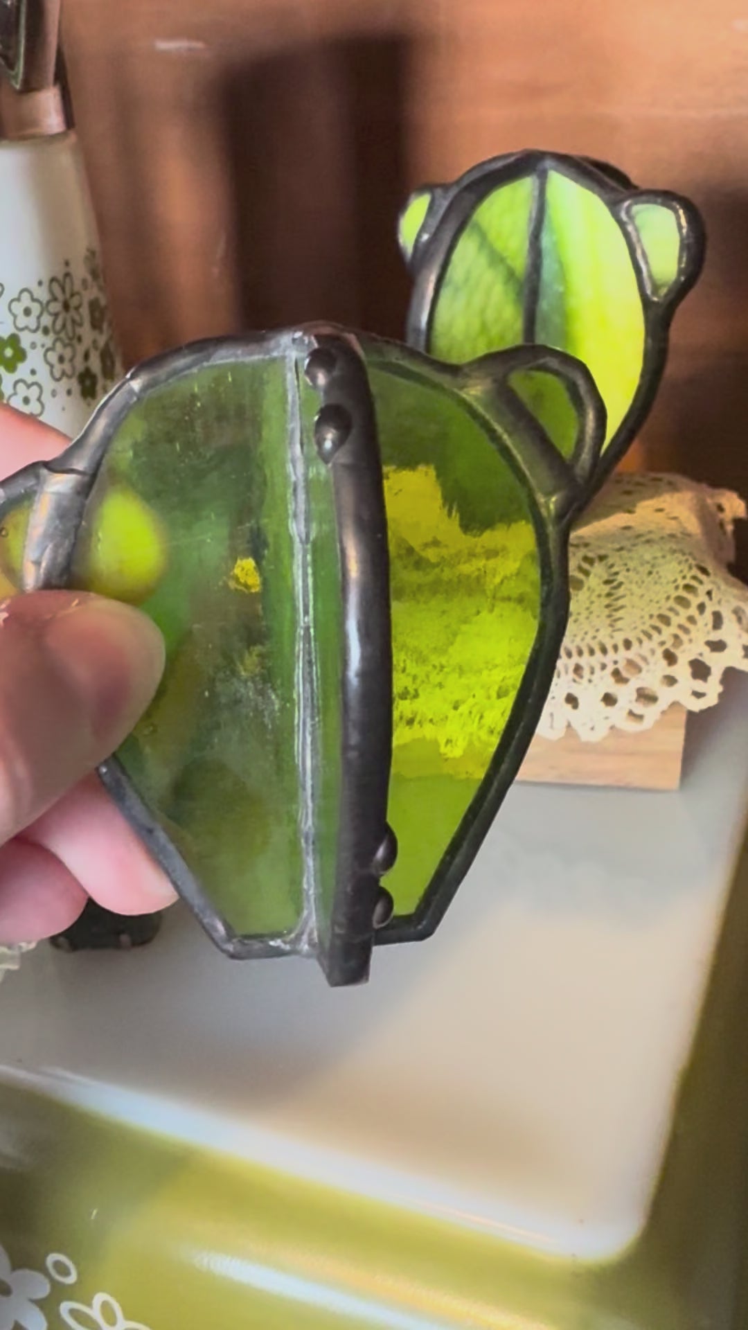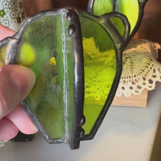 This green glass was sourced out of the scraps at Ragland Park at Kokomo Opalescent Glass Company. They measure approximately 2.5x2.75 inches at the widest/tallest points.