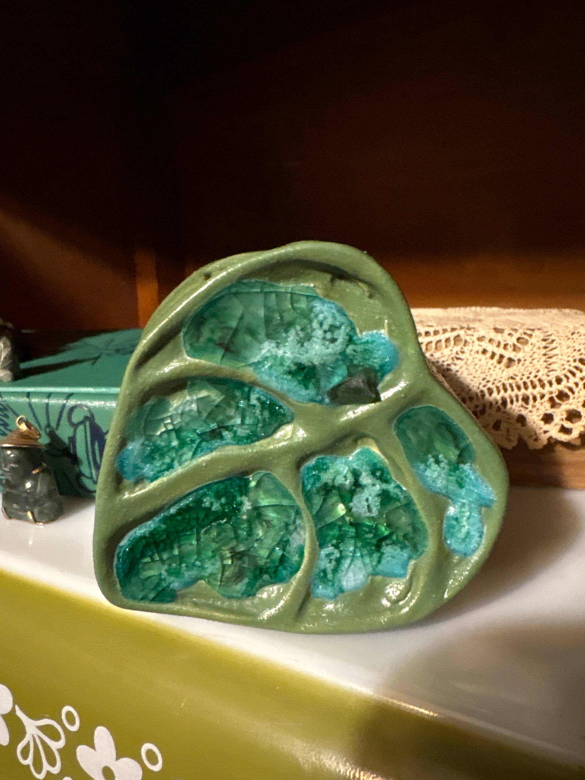Sometimes I dabble in ceramics and when I do I love to find ways to mix ceramics with glass. In this case I used my monstera stained glass pattern to cut out a monstera leaf vase, then I scraped out the clay in leafy patterns to create divots where I put some of my cool scrap glass for it to melt in the kiln. The result is a cool green leaf vase with a cloisonne inspired glass effect. You can sit this piece on a shelf as is for decor or it has an opening in the top to be used as a vase - it is glazed all around so it is water-tight.