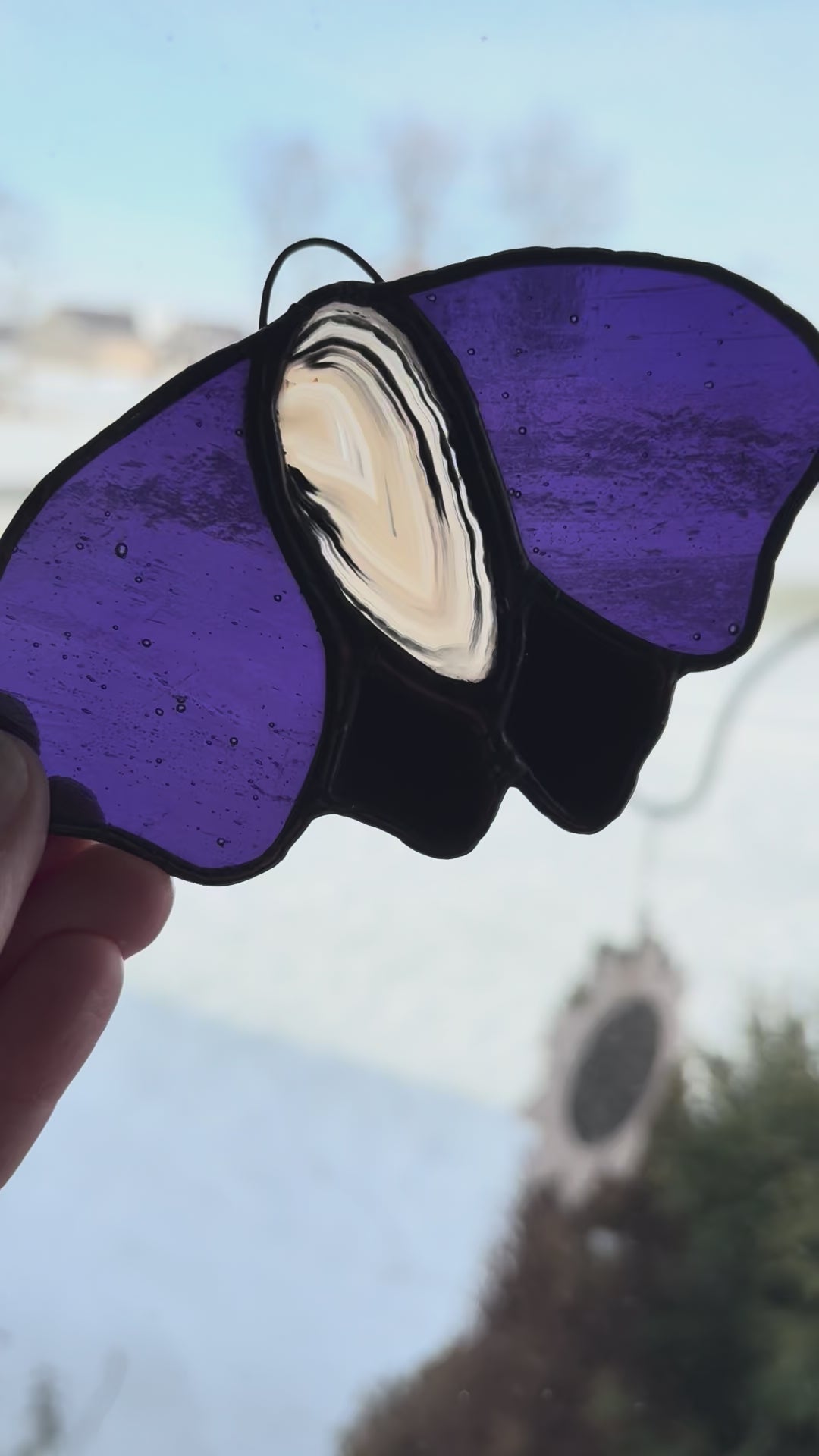 After finding my Amber geode to create the amber moth - I went on the search for more geodes and I created this guy with a fun black and white geode center, opaque black wings, and vibrant purple wings! A slightly different colorway than I’d usually do but I had a lot of fun with it.