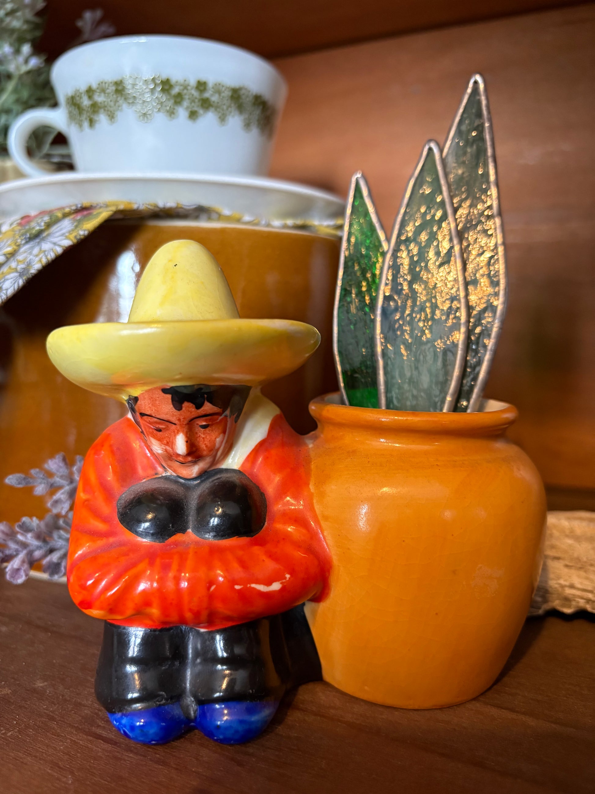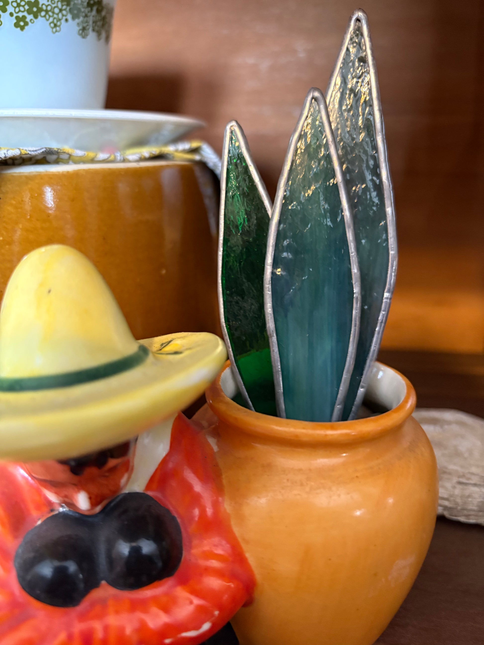 This is a snake plant with three fronds and it’s potted in a thrifted spanish-style vase with river rock. The snake plant is removable on the pot and soldered to a brass rod to give it structure when inserted into the pot.