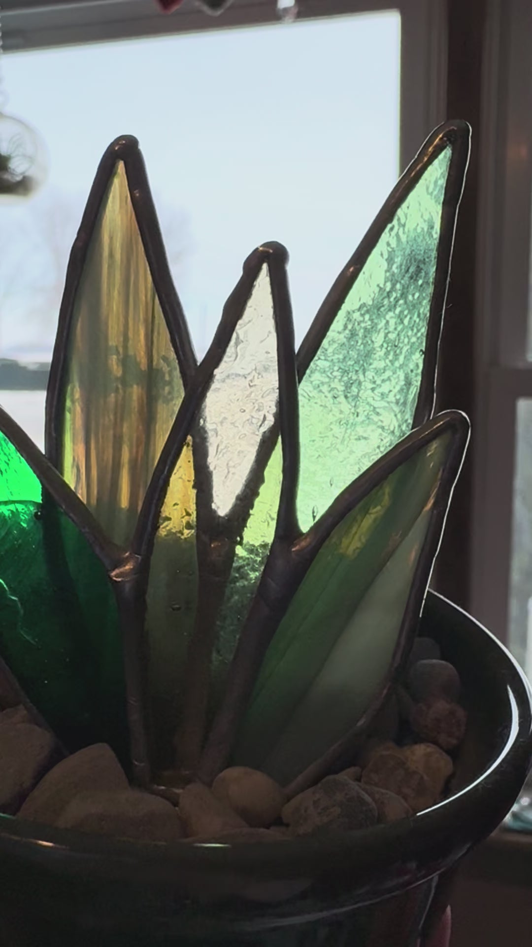 Materials: Glass, Copper Foil, Lead Solder, Finishing Wax, Ceramic Pot, River Rock