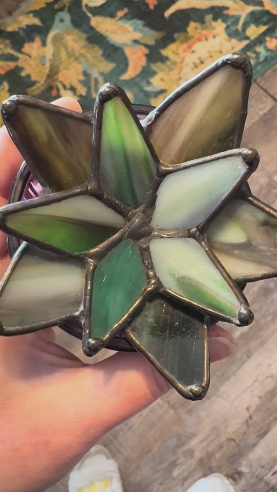 The succulent in this listing has 10 petals. This succulent is made from a continuous piece of glass that I scavenged out of Ragland Park glass scraps at Kokomo Opalescent Glass Company and its filled with gorgeous purples streaking thru the green. The vase measures approximately 3 inches round and the succulent measures approximately 4x4inches top measurements.