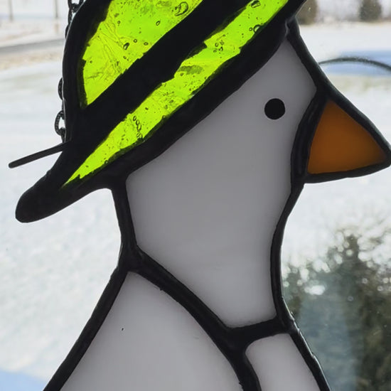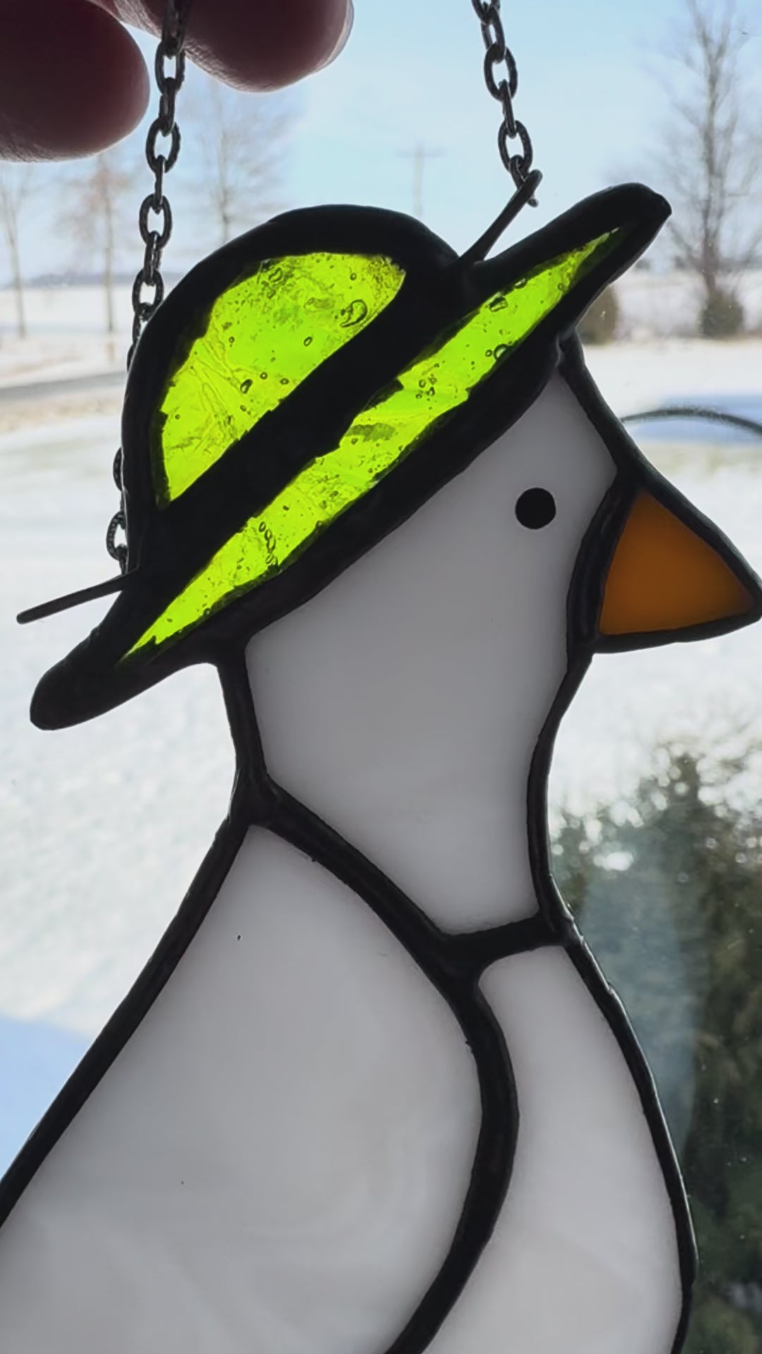 I’m obsessed with porch geese and all things goose iconography! I had to make a cute lil goose to adorn your windows! This one comes with a cute gem cut glass hat in a bold olive green.
